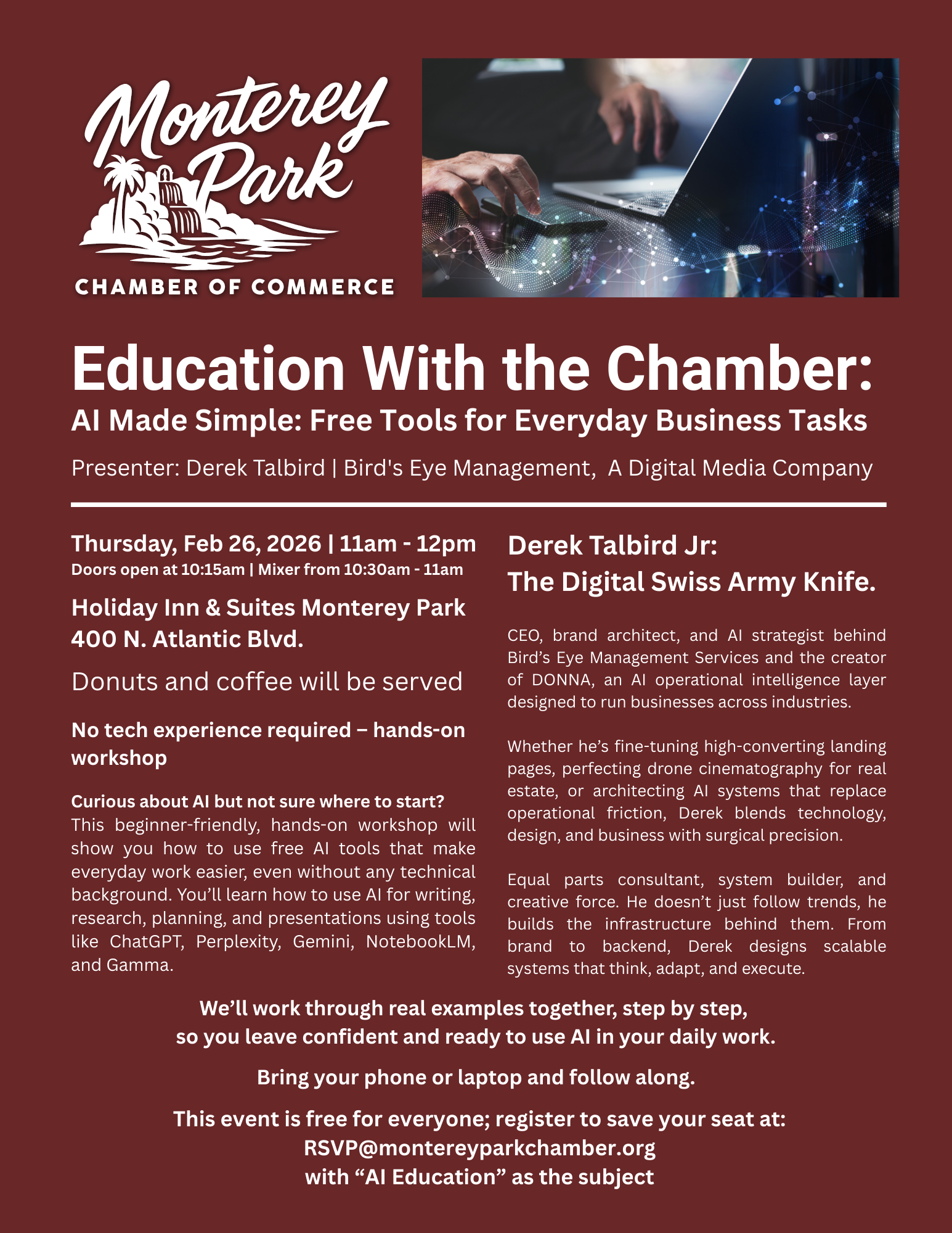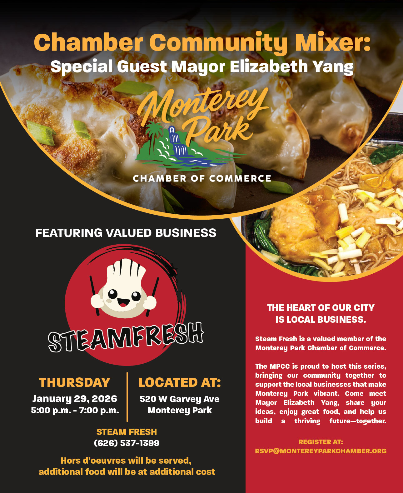 The Monterey Park Chamber of Commerce is a vibrant, transparent, and integrity-driven nonprofit organization dedicated to promoting, connecting, and invigorating our city and business community.