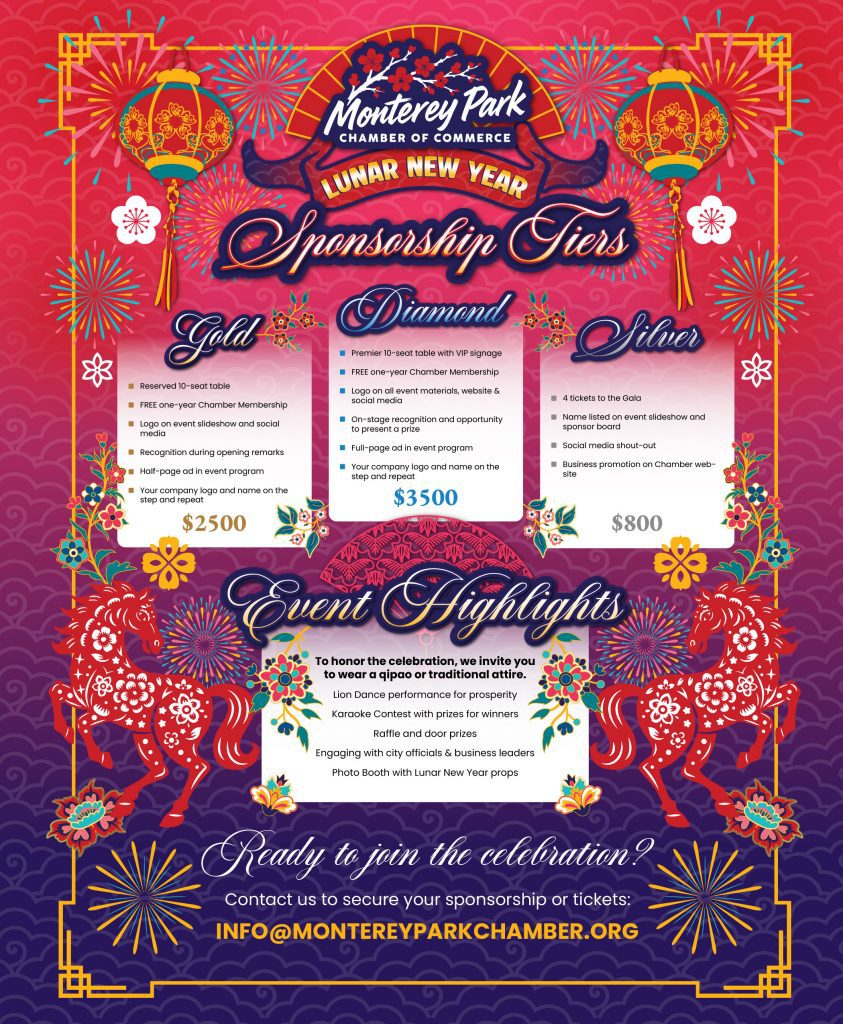 The Monterey Park Chamber of Commerce cordially invites you and your guests to our inaugural Lunar New Year Gala—an evening of celebration, connection, and community prosperity.